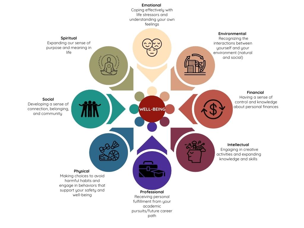 Each dimension highlights a different area of wellness to ensure that we are paying attention to our wellness in a variety of ways. Wellness encompasses more than just mental and physical health and the eight dimensions allows us to recognize the many ways we can find a path to wellness and well-being.
